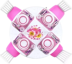 Komplektā ir apaļš galds, 4 krēsli, divu veidu šķīvji, palikņi, pilns galda piederumu komplekts 4 personām, 8 glāzes un dekoratīva vāze ar ziediem – viss saskaņots elegantā baltā–rozā kombinācijā.