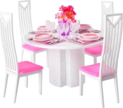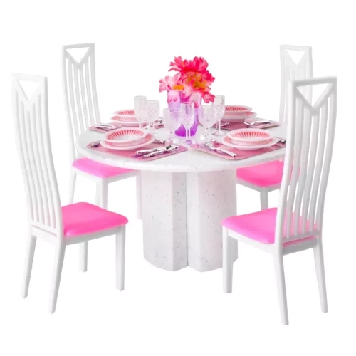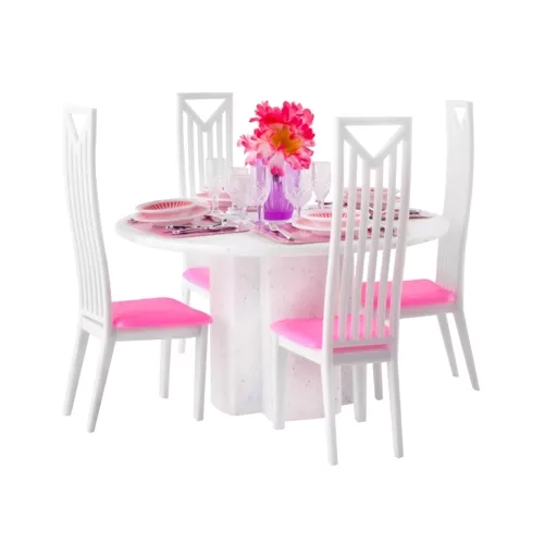 Šis pārdomātais mēbeļu komplekts pārvērš jebkuru leļļu mājiņu mājīgā ēdamistabā. Pateicoties reālistiskām detaļām – no rozā paliktņiem līdz šķīvjiem, galda piederumiem un glāzēm – bērni izbaudīs stundām ilgas fantāzijas rotaļas un maltītes ar lellēm.