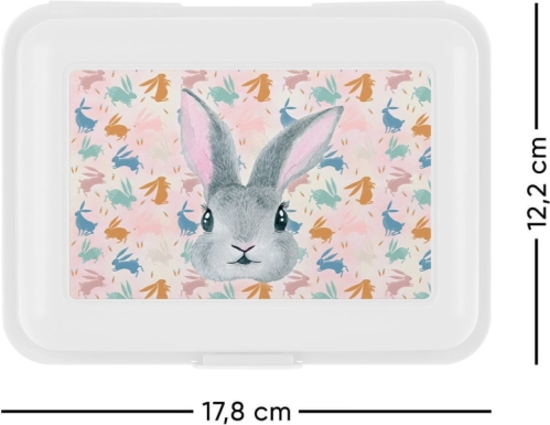 Minimalistisku balto dizainu papildina aizraujošais Bunny motīvs, kas iepriecinās gan bērnus, gan rotaļīgu detaļu cienītājus. Kārbiņa ir viegla, ērti pārnēsājama un der gan skolas mugursomā, gan rokassomā.