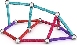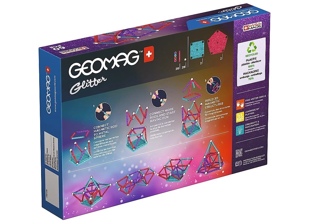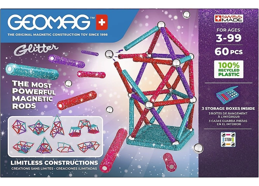 Mirdzošais Geomag Glitter konstruktors piedāvā bezgalīgas būvēšanas iespējas, pateicoties spēcīgiem magnētiem un košām krāsām ar gliteru efektu. Bērni rotaļājoties trenē fiziku, ģeometriju un telpisko uztveri, vienlaikus radot oriģinālus modeļus no vienkāršām formām līdz pat sarežģītākām konstrukcijām. Materiāls no 100% pārstrādātas plastmasas ir izturīgs un saudzīgs dabai.