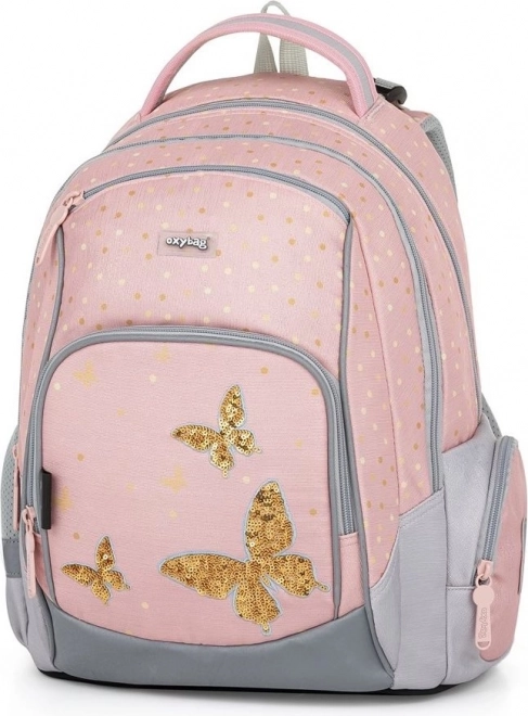 Skolas mugursoma OXY GO maigā dizainā ar tauriņu motīvu iepriecinās ne tikai ar izskatu, bet arī pārdomātu ergonomiku. Pateicoties elpojošai muguras daļai un regulējamām plecu siksnām, tā nodrošina komfortu visas dienas garumā un atbalsta pareizu ķermeņa stāju. Zemais svars 0,99 kg un atstarojošie elementi palielina drošību ceļā uz skolu.