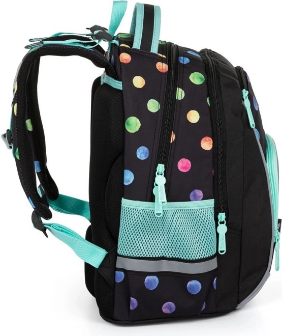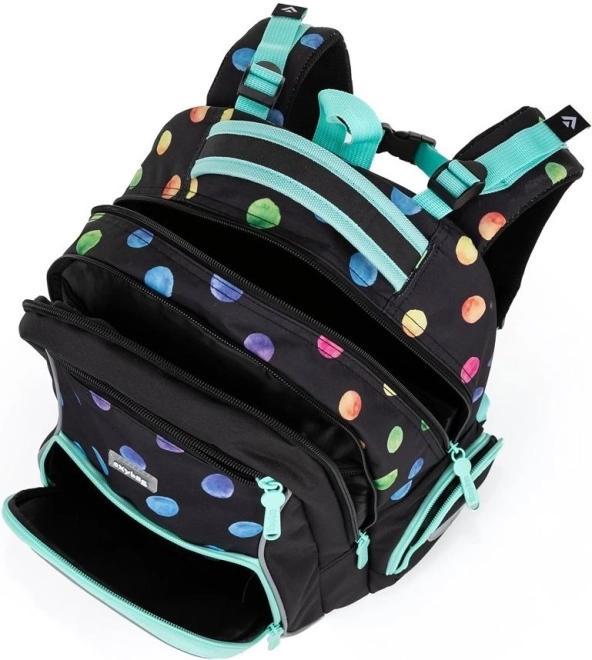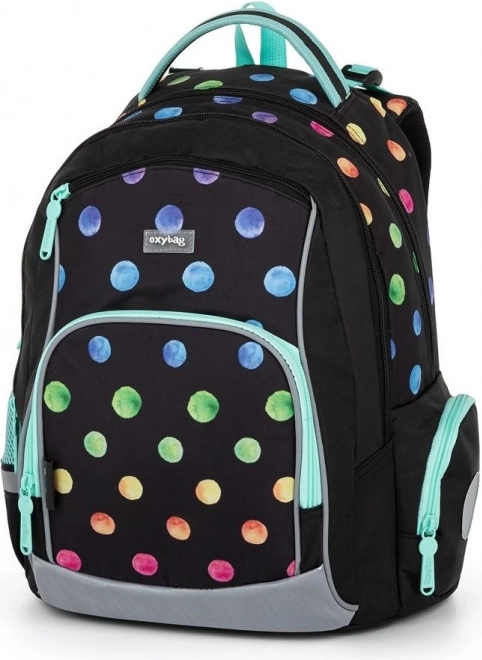 Skolas komplekts Oxybag OXY GO Dots ir paredzēts bērniem no 125 cm auguma un piedāvā ideālu komforta, izturības un pievilcīga dizaina ar daudzkrāsainiem punktiņiem apvienojumu. Mugursoma sver tikai 0,99 kg, tai ir stingra un elpojoša muguras daļa un regulējamas plecu lences veselīgai un ērtai nēsāšanai. Pateicoties atstarojošajiem elementiem, bērns ir labāk pamanāms arī sliktākos gaismas apstākļos.