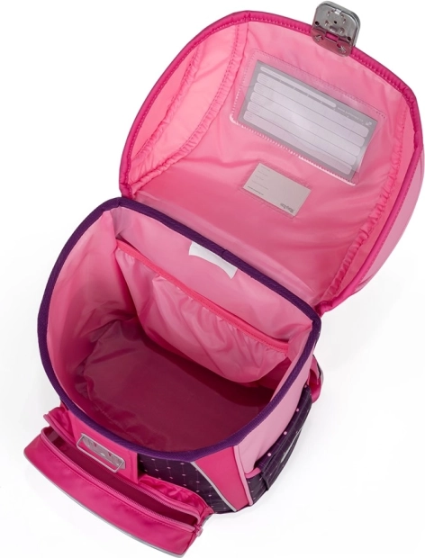 Galvenā kamera ar iekšējo kabatu, vārda zīmīti un stundu sarakstu nodrošina efektīvu skolas piederumu organizēšanu. Priekšējās un sānu kabatas piedāvā vietu uzkodu kārbiņai un citiem piederumiem.