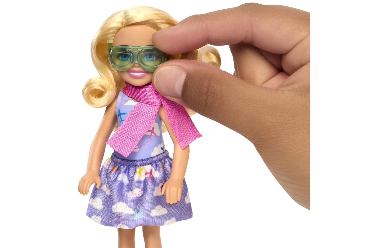 Lellīte ir ģērbta mīlīgā kleitiņā ar mākoņu apdruku, tai ir stilīgs rozā lakatiņš un aizsargbrilles. Piederumi – koferis, uzlīmes un brilles lellītei un sunītim – paceļ spēli tematiskās misijās, ceļošanā un savu stāstu veidošanā. Ideāla dāvana bērniem no 3 gadu vecuma, kuri mīl lidmašīnas, ceļošanu un BARBIE un CHELSEA pasauli.
