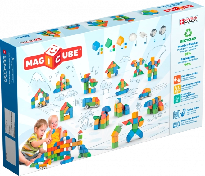 GEOMAG MAGICUBE SHAPES sniedz bērniem no 1 gada gudru izklaidi ar magnētiskiem klucīšiem un formām, kas viegli un droši pievelkas cita pie citas. Komplektā ir 25 detaļas, tostarp ritenīši, lai mazie būvētāji varētu radīt ne tikai torņus un namiņus, bet arī vienkāršus transportlīdzekļus un kustīgus modeļus. Košās krāsas veicina krāsu un formu atpazīšanu, sīko motoriku un telpisko iztēli.