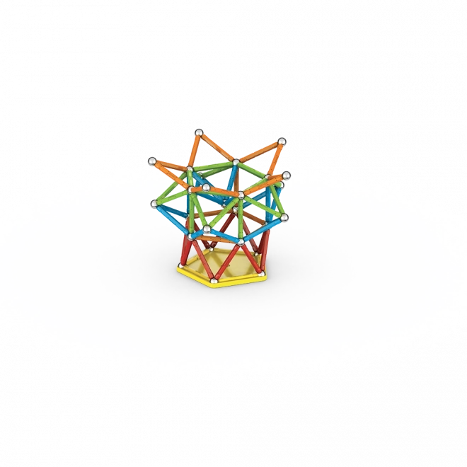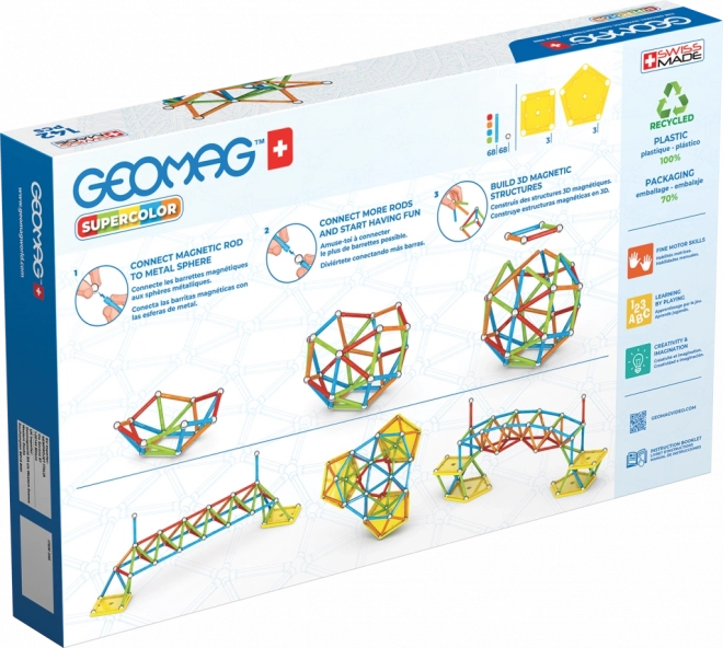 Atklājiet radošo magnētisko konstrukciju pasauli ar GEOMAG Supercolor konstruktorseti ar 142 detaļām no 100 % pārstrādātas plastmasas. Krāsainie stieņi, tērauda lodītes un pamatnes ļauj veidot bezgalīgus 3D modeļus, kas attīsta radošumu, telpisko iztēli un sīko motoriku. Šveices kvalitāte, droši materiāli un ilgs kalpošanas laiks padara šo komplektu par ideālu izvēli gan bērniem, gan pieaugušajiem.