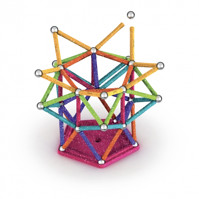 Ar Geomag Glitter konstruktors varat viegli uzbūvēt gan vienkāršas formas, gan izstrādātas 3D konstrukcijas. Krāsainās nūjiņas ar mirdzuma efektu kombinācijā ar izturīgām tērauda lodītēm un pamatnēm nodrošina stabilus un iespaidīgus modeļus, kas iedvesmo bērnus un pieaugušos eksperimentēt.