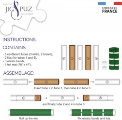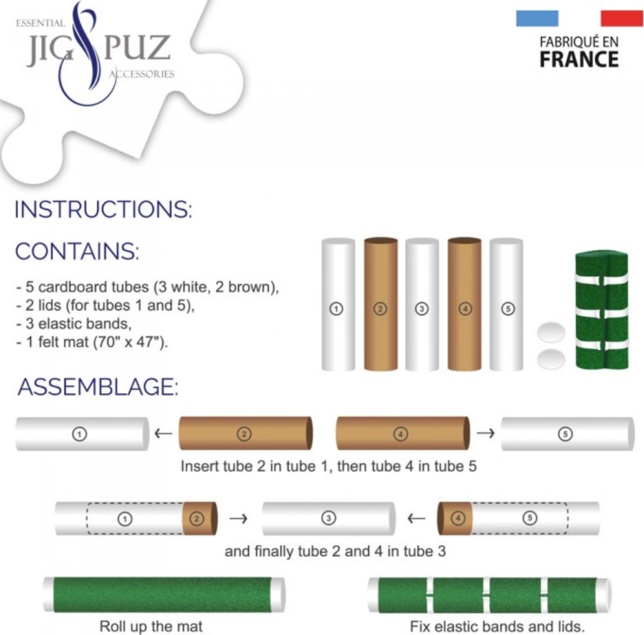Komplektā ir viss nepieciešamais: kartona tubusi stingram kodolam, filca paklājs 180 × 120 cm, plastmasas vāciņi un nostiprināšanas siksnas. Pateicoties lielajam izmēram, paklājs piedāvā pietiekami daudz vietas arī ērtai gabaliņu šķirošanai pēc formām un krāsām, kas paātrina un padara patīkamāku likšanu.