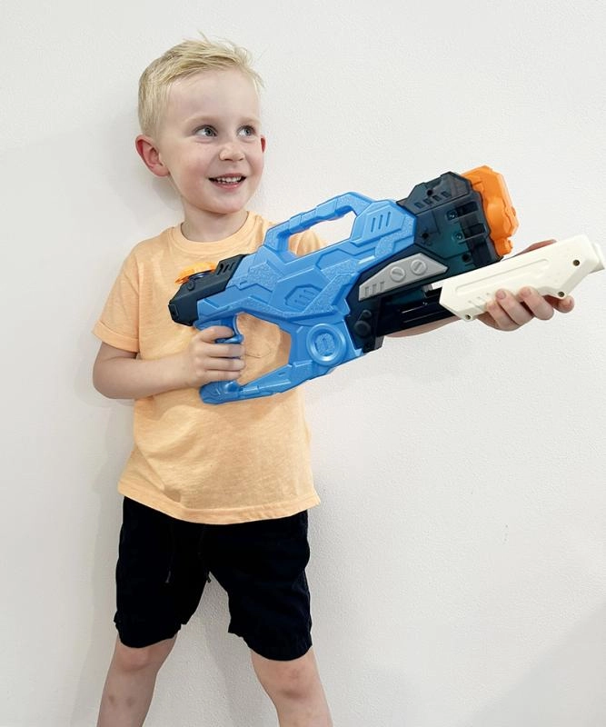 Izturīgs plastmasas izpildījums, ergonomiska roktura forma un vienmērīga sprūda darbība nodrošina ērtu un drošu lietošanu. Futuristiskais dizains zilā–melnā krāsu salikumā patiks gan mazajiem, gan lielajiem cīnītājiem un veicinās aktīvas nodarbes svaigā gaisā.