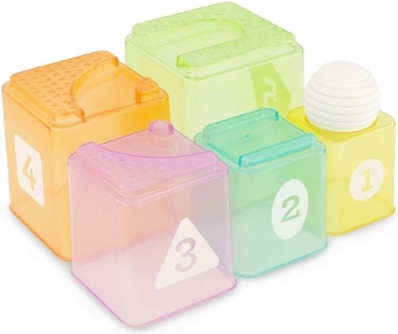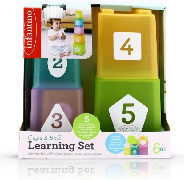 Infantino saliekamo kausiņu komplekts ar bumbiņu ir ideāls pirmajai formu, krāsu un skaitļu izzināšanai. Caurspīdīgos kausiņus ar skaidriem skaitļiem var sakārtot no mazākā līdz lielākajam un būvēt stabilus torņus, kas attīsta sīko motoriku un telpisko uztveri.