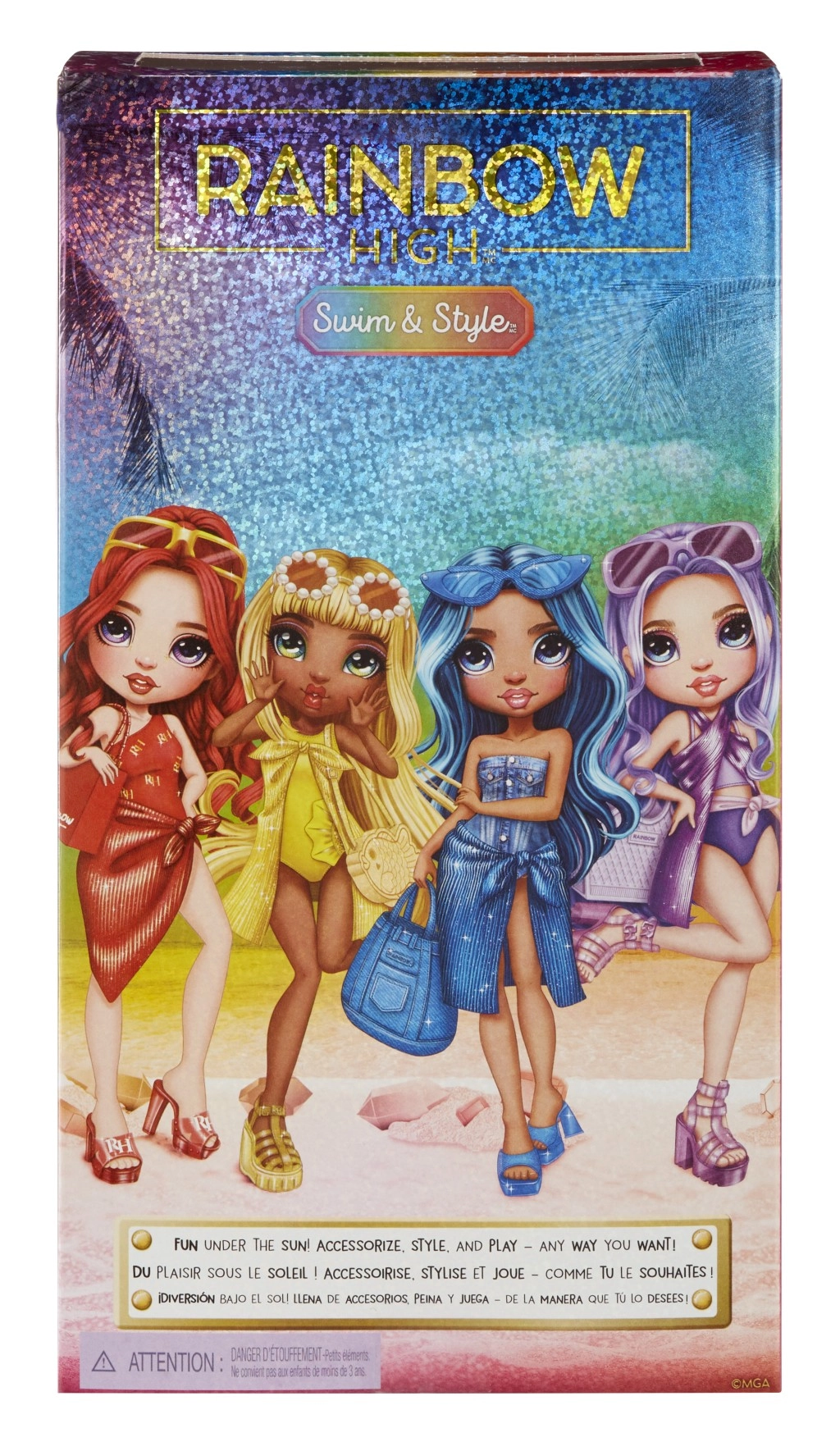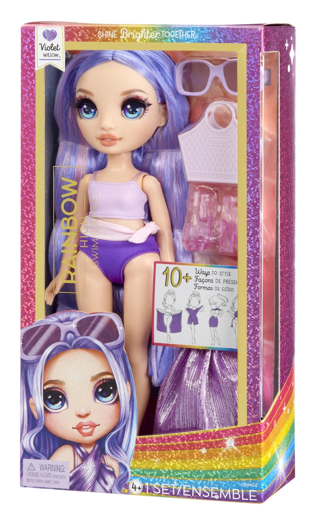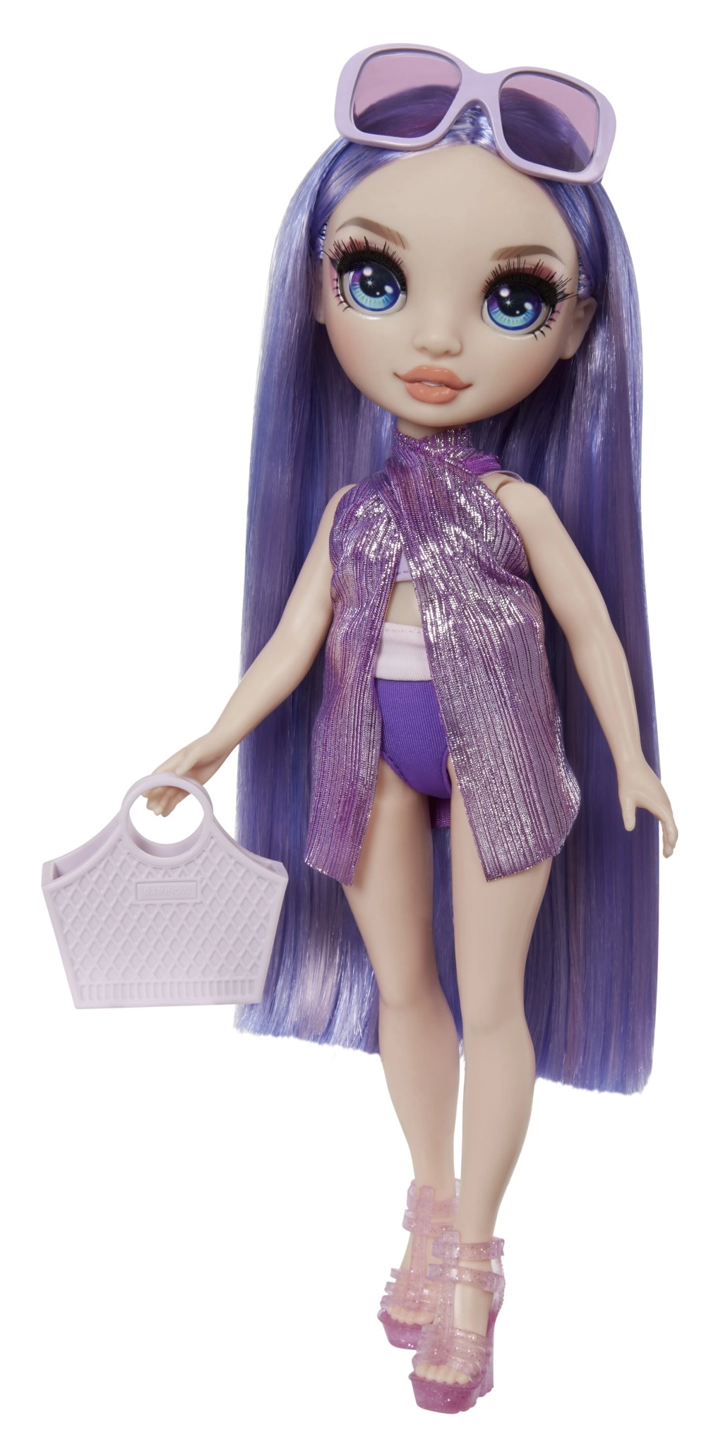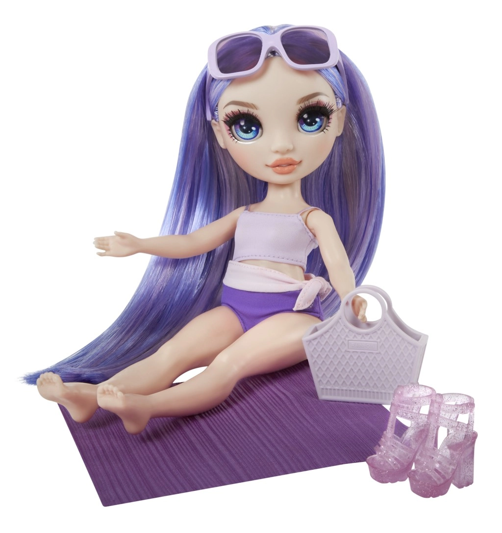 Rainbow High lelle pludmales stilā violetā krāsā ir gatava vasaras piedzīvojumiem. Viņa ir tērpta skaistā peldkostīma komplektā un aprīkota ar aksesuāriem, kas izceļ viņas unikālo stilu. Kolekcija Rainbow High Swim & Style piedāvā vairāk nekā 10 dažādas stilizācijas, kuras var kombinēt un kolekcionēt.