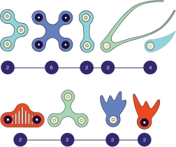Daudzvirzienu detaļas ar 360° rotāciju un fiksāciju 24 pozīcijās stingri turas kopā un ļauj būvēt stabilas 2D un 3D konstrukcijas.