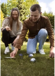 Izbaudiet tradicionālo spēli Pētaņka ar pilnu komplektu 2–6 spēlētājiem: 6 hromētas metāla bumbiņas (Ø 7,3 cm), koka mērķa bumbiņu (košonku), mērlenti/virvi un izturīgu neilona somiņu. Bumbiņām ir iegravēti raksti vienkāršai atšķiršanai, un komplekts ir piemērots spēlei uz jebkuras līdzenas virsmas.