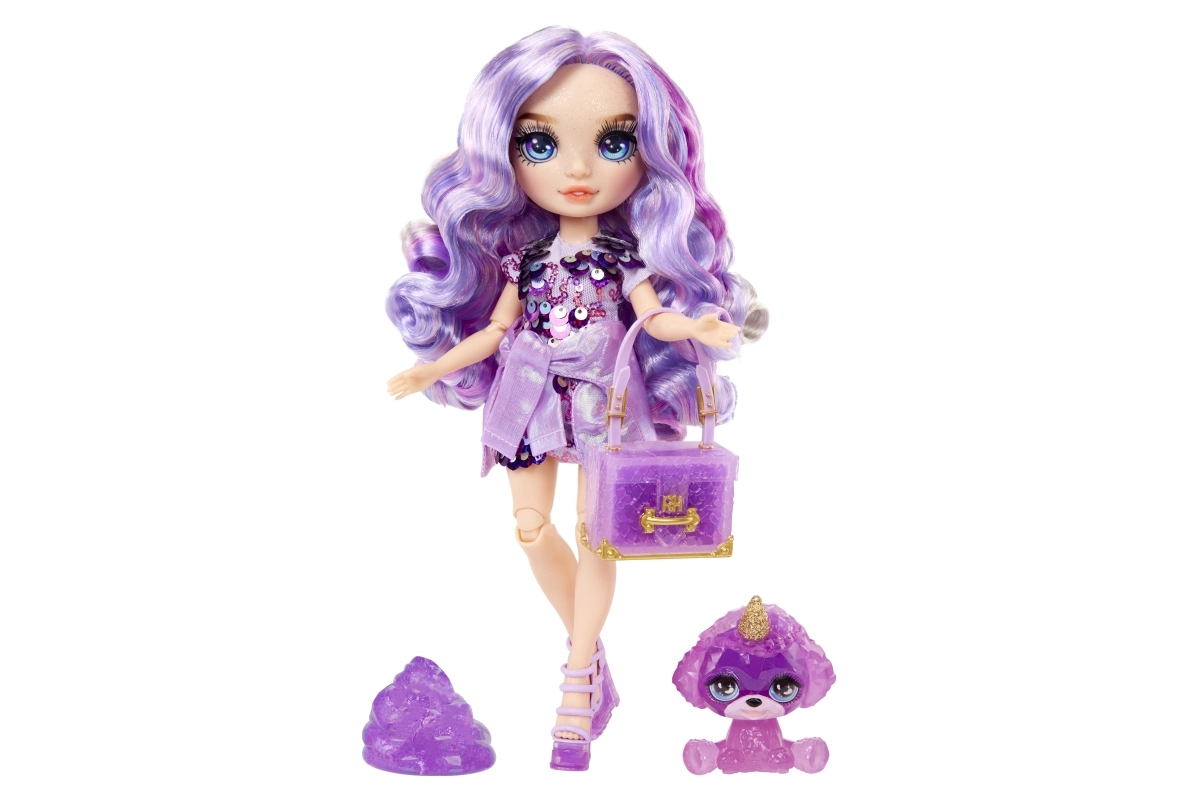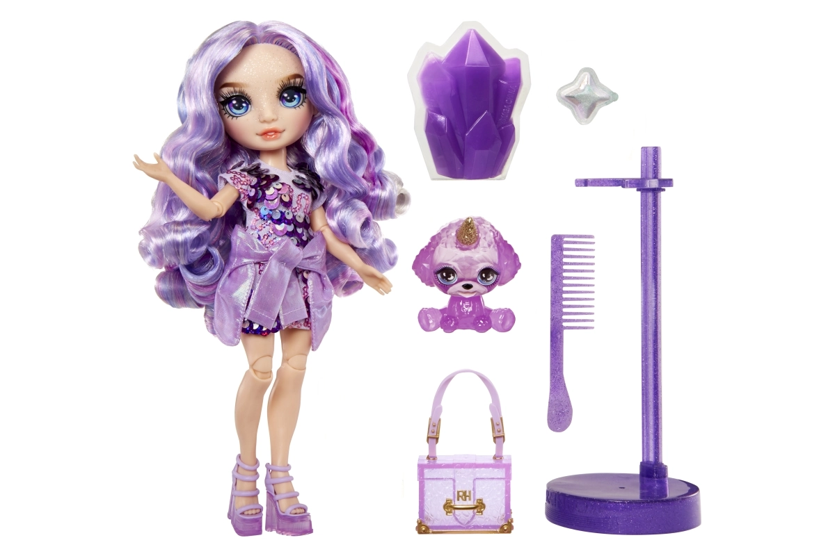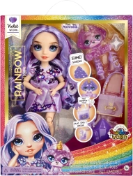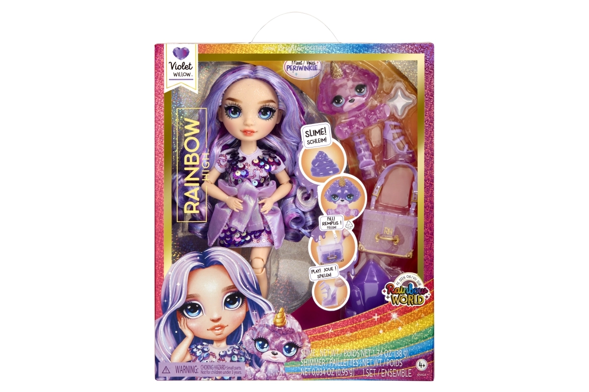 Atklājiet Rainbow High pasauli ar Violet lelli, kas piedāvā bezgalīgas spēļu un radošās izpausmes iespējas. Lelle ir elastīga, un tās locītavas nodrošina plašu kustību diapazonu, tādējādi sniedzot vairāk iespēju radošumam. Katrai lellei ir savs maģiskais mīlulis, kura krāsu var mainīt ar gļotām. Lelle ir aprīkota ar unikāliem modes aksesuāriem, piemēram, nomaināmiem apaviem un somiņu, ko var dekorēt ar gļotām. Turklāt komplektā ir statīvs, lai lelli varētu izstādīt un tā vienmēr būtu gatava spēlei.