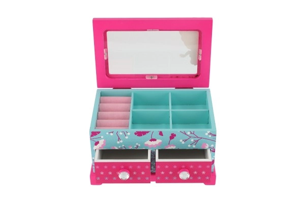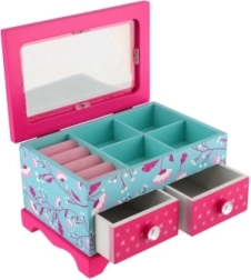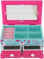Augšējā daļa ar spogulīti un sadalītām nodalījumu sekcijām plus divas ietilpīgas atvilktnes palīdz glabāt rotas un sīkumus kārtībā un pārskatāmi.
