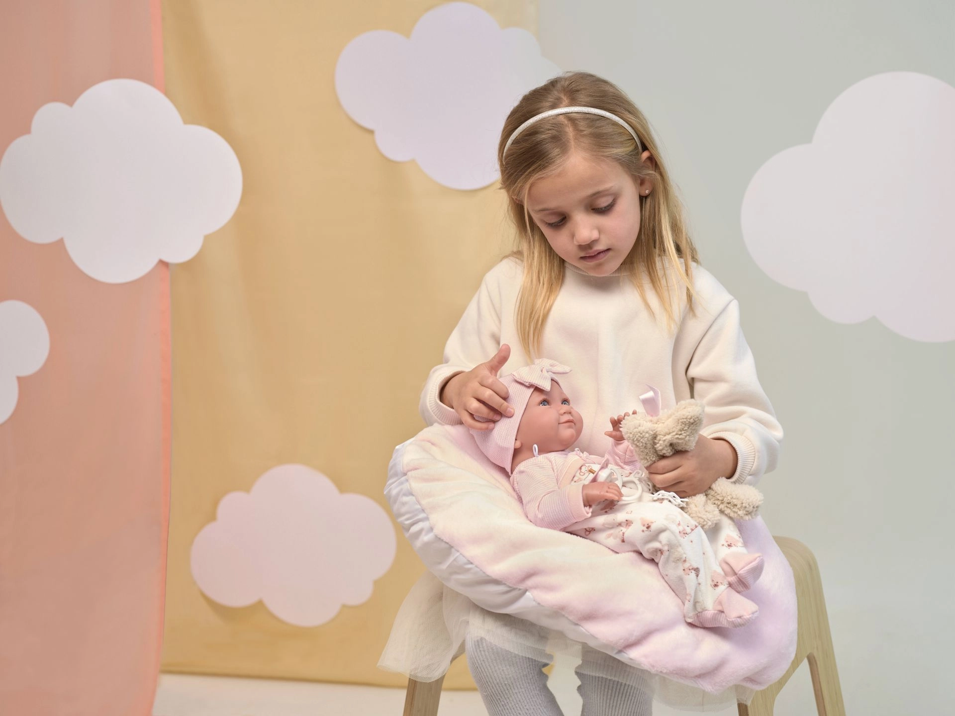 Iepakojumā iekļauts divdaļīgs apģērbu komplekts un spilventiņš, lai bērni varētu rotaļāties aizmigdināšanā vai pārtīšanā. Lellei ir kustīgas rokas, kājas un galva, kas veicina sīko motoriku un radošu spēli. Ideāla dāvana gan mazajām gādīgajām saimniecēm, gan leļļu kolekcionārēm.