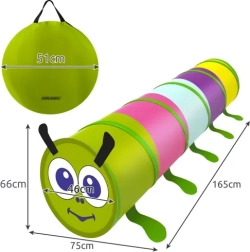 Šis mīlīgais bērnu tunelis kāpura formā sajūsminās mazos izpētnieku. Divas ieejas/izejas un mīkstā tekstila konstrukcija aicina spēlēt paslēpes, rāpot un rīkot sacensības. Pateicoties elastīgajam tērauda rāmim tunelis izplešas pats, un pēc spēlēm to viegli salocīt atpakaļ kompaktā somiņā.