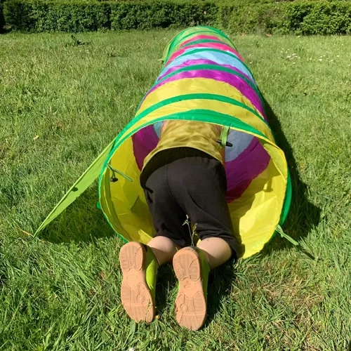 Tunelis izgatavots no izturīga poliestera ar EPE putām un stabila tērauda rāmja. Daudzkrāsainais noformējums stimulē maņas un attīsta koordināciju un līdzsvaru. Ideāli piemērots lietošanai telpās uz līdzena un stabila seguma.