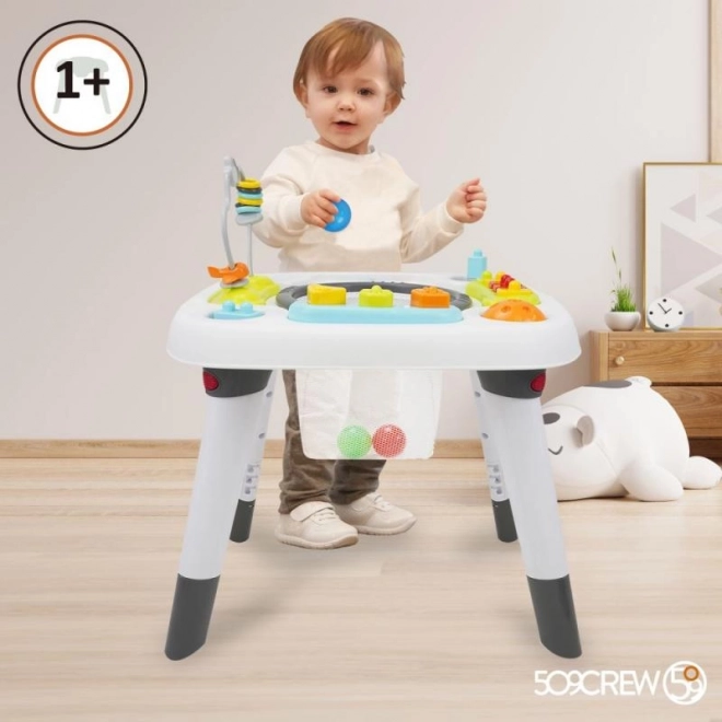 Interaktīvais bērnu spēļu galds 3 vienā ir vairāk nekā tikai rotaļlieta. Pirmajā posmā bērns var izzināt pasauli no ērta sēdeklīša, ar rotaļlietām, kas ir viegli aizsniedzamas. Otrajā posmā tiek piedāvāta izklaide, apgūstot staigāšanu un mijiedarbojoties ar interaktīvām un krāsainām rotaļlietām, kas izvietotas apkārt galdam. Trešais, noslēdzošais posms pārvērš galdu par funkcionālu mēbeli, kas var kalpot spēlēm, ēšanai vai citām radošām nodarbēm.