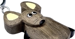Šis koka piekariņš pele ir roku darbs no rūpīgi atlasītiem koku veidiem ar dabisku krāsojumu – bez papildu krāsošanas. Katrs gabals ir oriģināls, viegli ar roku apgleznots, lai izceltu detaļas. Praktiskais metāla gredzens nodrošina vienkāršu un drošu atslēgu piestiprināšanu.