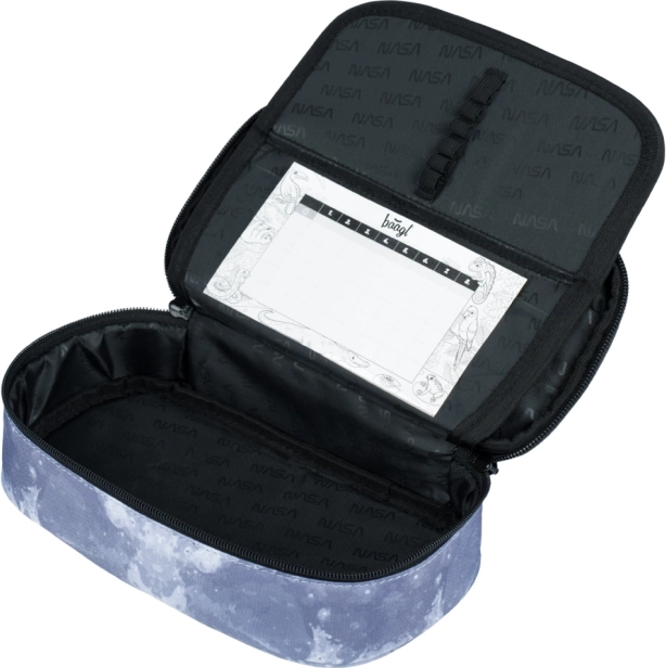 Etui tipa penālis no pārstrādāta materiāla ir ar atlokāmu starpsienu, kabatu ar rāvējslēdzēju un nodalījumu stundu sarakstam. NASA motīva maisiņš ir no izturīga, mazgājama materiāla, un pateicoties auklām to var nēsāt arī uz muguras. Viss komplekts ir paredzēts ikdienas slodzei un testēts akreditētā laboratorijā.