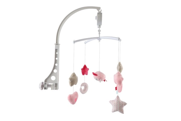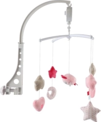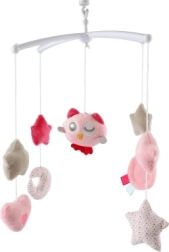 Nomieriniet mazuli ar maigu kustību un melodiju, ko piedāvā šis rozā griestiņu karuselis virs gultiņas ar pūcīti. Pateicoties uzvelkamajam muzikālajam mehānismam un mīkstajiem piekariņiem (zvaigznītes, sirsniņas, mēnestiņš), tas palīdz izklaidēt un iemidzināt bērnu. Viegla stiprināšana pie gultiņas un maigas pasteļkrāsas lieliski iederas jebkurā bērnu istabā.