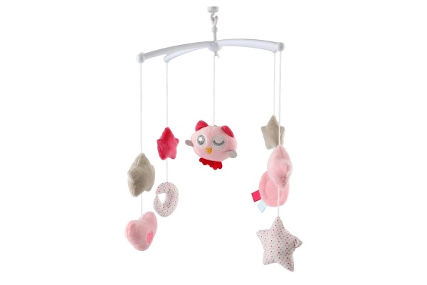 Rozā muzikālais karuselis virs gultiņas ar pūcīti sniedz bērniem mieru un drošības sajūtu. Mīkstie piekariņi zvaigznīšu, sirsniņu un mēnestiņa formā viegli šūpojas, kamēr mehāniskais uzvelkamais mehānisms atskaņo patīkamu melodiju. Klusa darbība un vizuāli pievilcīgas pasteļkrāsas rada nomierinošu atmosfēru pirms iemigšanas.