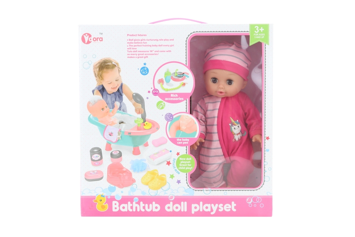 Komplektā atradīsiet visu nepieciešamo peldēšanās rituālam: šampūnu, ziepes, vannas putas, podiņu un citus sīkus piederumus. Lelle 28 cm ērti turama bērna rokās un ir ideāla spēlēšanai mājās vai ceļā. Lieliska dāvana bērniem no 3 gadu vecuma, kas veicina lomu spēles un rūpju prasmes.