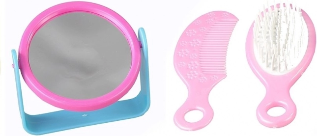 Mīlīgs kosmētikas komplekts caurspīdīgā somiņā iepriecinās visas mazās rotātājas. Tas ietver darbojošos rotaļu fēnu ar baterijām, spogulīti uz statīva, birsti un ķemmi, matu aksesuārus un ēnu paleti un lūpu krāsu drošai, radošai spēlei. Vieglā plastmasas konstrukcija bez asām malām, CE sertifikācija un ideāls izmērs bērnu rokām nodrošina drošu un ilgstošu izklaidi.