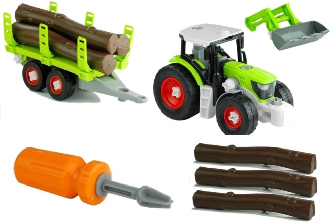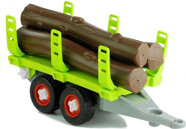 Rotaļlieta ietver traktoru, piekabi, koka baļķus un rakšanas sviru, viss izgatavots no izturīgas plastmasas.