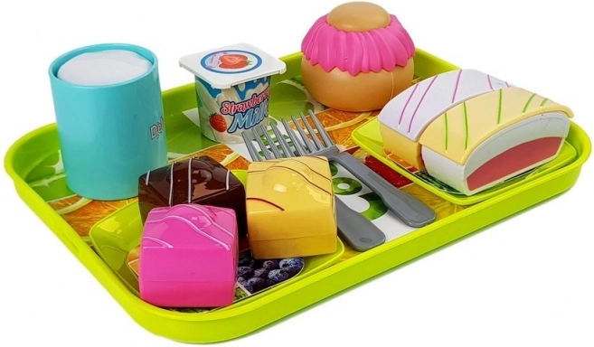 Komplektā ir daudzveidīgi piederumi – no paplātes un šķīvjiem līdz dažādiem reālistiski izskatīgiem desertiem, ļaujot bērniem izjust gatavošanas prieku.