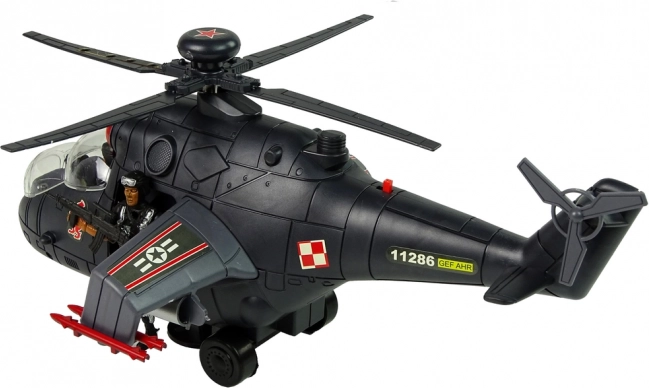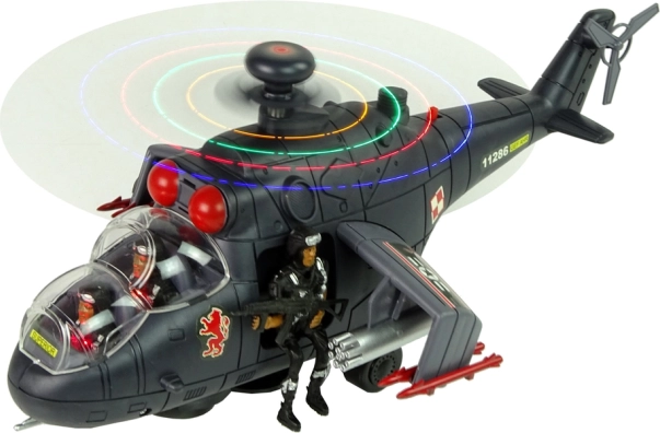 Izgatavots no izturīga plastmasas materiāla, ar milzīgiem rotējošiem spārniem, kas aprīkoti ar krāsainām LED diodēm. Kabīnē atrodas karavīru figūriņas – trīs komplektā, viens no tiem ar šauteni, gatavs misijai.