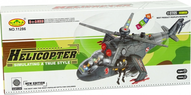 Gaismas efektus pavada skaņas efekti, piemēram, iedarbināšanas un šaušanas skaņas. Riteņi zem helikoptera nodrošina kustību.