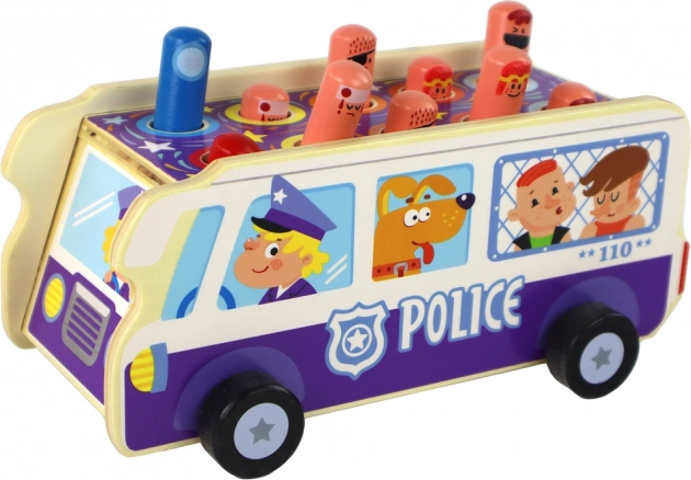 Policijas autobuss no masīvkoka apvieno tradicionālo “sitamo” spēli ar braukšanu uz riteņiem. Bērni ar āmuriņiem sit pa izvirzītajiem tapas–figūriņām un trenē precizitāti, koncentrēšanos un vērīgumu. Izturīgais izpildījums un rotaļīgās ilustrācijas aicina spēlēt atkal un atkal un veicina iztēli.