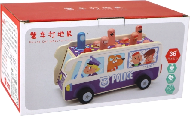 Izklaidējoša koka veiklības spēle policijas autobusa veidā attīsta sīko motoriku, acu–roku koordināciju un ātras reakcijas. Bērni ar āmuriņu “sit” pa izlecinošām figūriņām, un pateicoties riteņiem var izbaudīt arī braukšanu ar autobusu. Kvalitatīvs koka izpildījums, droši materiāli, CE sertifikācija un atbilstība EN71 mierīgai un drošai bērnu spēlei.