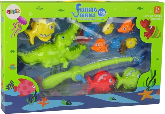 Ietver makšķeri ar spoli, 6 mazas zivtiņas, 3 lielas zivis un rotaļu krokodilu.