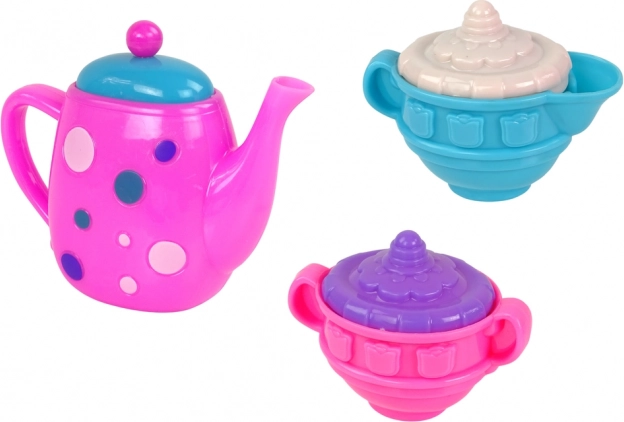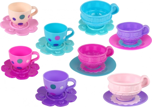 Komplektā ietilpst: 4 krāsaini krūzīšu ieliktņi/kausiņi, 4 šķīvīši, 4 tējkarotes, 4 dakšiņas, 4 karotes, 4 bļodiņas, tējkanna, cukurtrauks un tējkannas kanniņa.