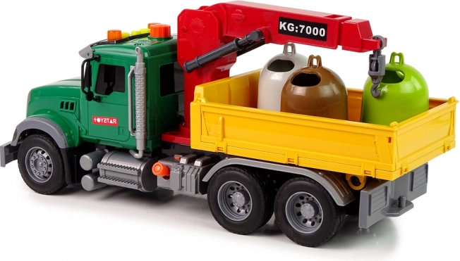 Šis detalizēti izstrādātais atkritumu savācēja kravas auto pārvadās visu nepieciešamo – no iekļautajiem konteineriem līdz pat sīkām rotaļlietām. Aizmugures piekabe ir aprīkota ar kustīgu celtni, kas viegli paceļ un noliek konteinerus. Uz kabīnes jumta atradīsiet vadības pogu, lai aktivizētu celtņa strēli un efektus.