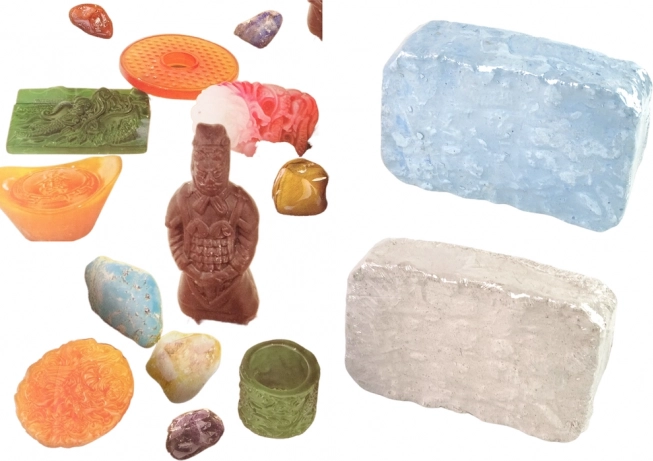 - 2 ģipša ieži, plastmasas aizsargbrilles, kaltiņš, āmuriņš, otiņa, smidzinātājs, kristāli/akmeņi, amuleti un figūriņas