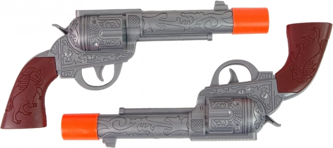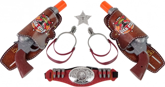 Šis pilnais kovboju aprīkojums pārvērtīs ikvienu bērnu par drošsirdīgu kārtības sargu. Pēc mēlītes nospiešanas revolveris atskaņo reālistisku šāviena skaņu (barošana ar AG13), kamēr josta ar makstīm tur pistoles vienmēr pa rokai. Drošie oranžie galiņi un kvalitatīva plastmasa nodrošina bezrūpīgas spēles gan mājās, gan ārā.