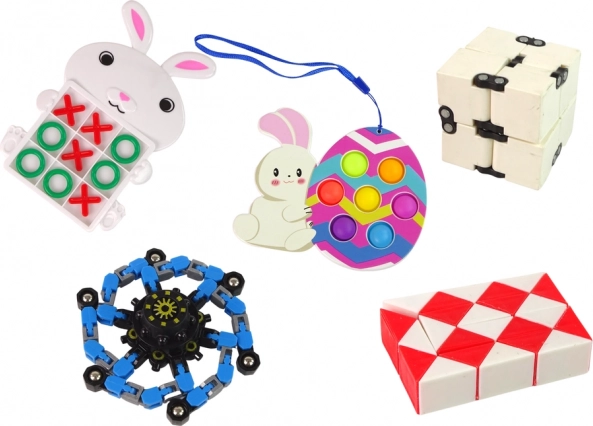 Šis tematiskā Lieldienu komplekts piedāvā krāsainu antistresa un sensoru rotaļlietu klāstu, kuras var spiest, stiept, locīt un klikšķināt. Tās palīdz bērniem uzlabot acs–rokas koordināciju, radošumu un loģisko domāšanu, vienlaikus veicinot koncentrēšanos un mieru rotaļās.