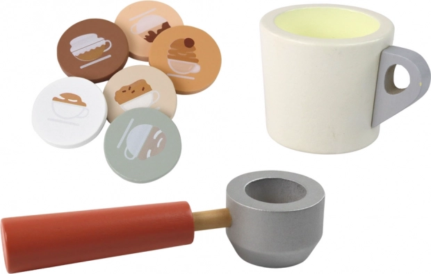 Kvalitatīvs koka un plastmasas apvienojums ir izturīgs un patīkams pieskārienam. Spēle ar kafijas automātu attīsta sīko motoriku, acu–roku koordināciju un sociālās prasmes kopīgās rotaļās. Pateicoties kompaktajiem izmēriem, automātu ir viegli pārnēsāt un nolikt.