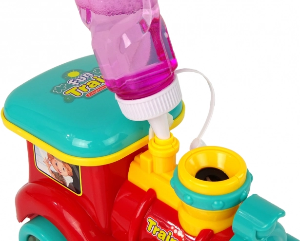 Iepakojumā iekļauts burbuļu šķīdums pudelītē, ar kuru lokomotīve rada desmitiem mirdzošu burbulīšu.