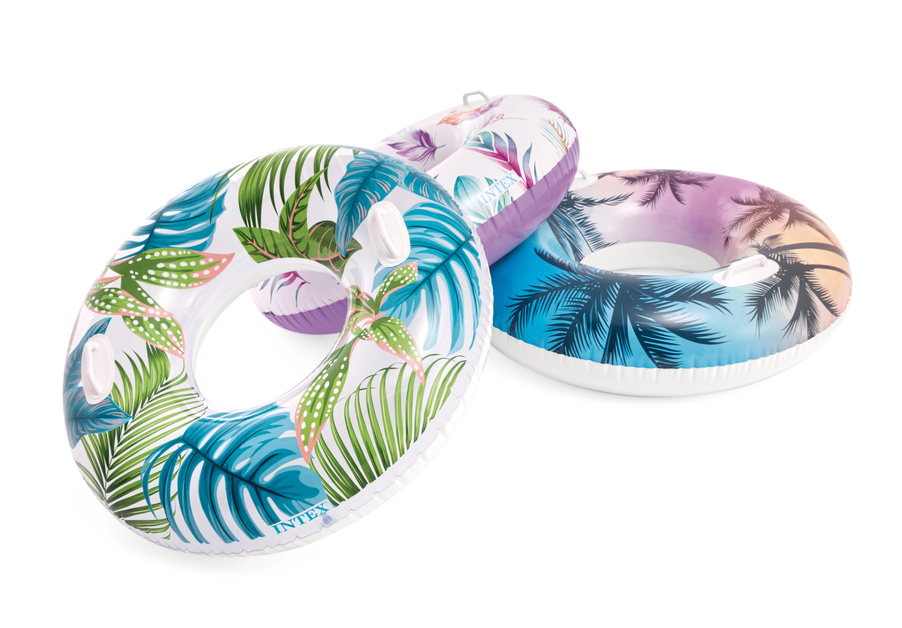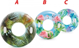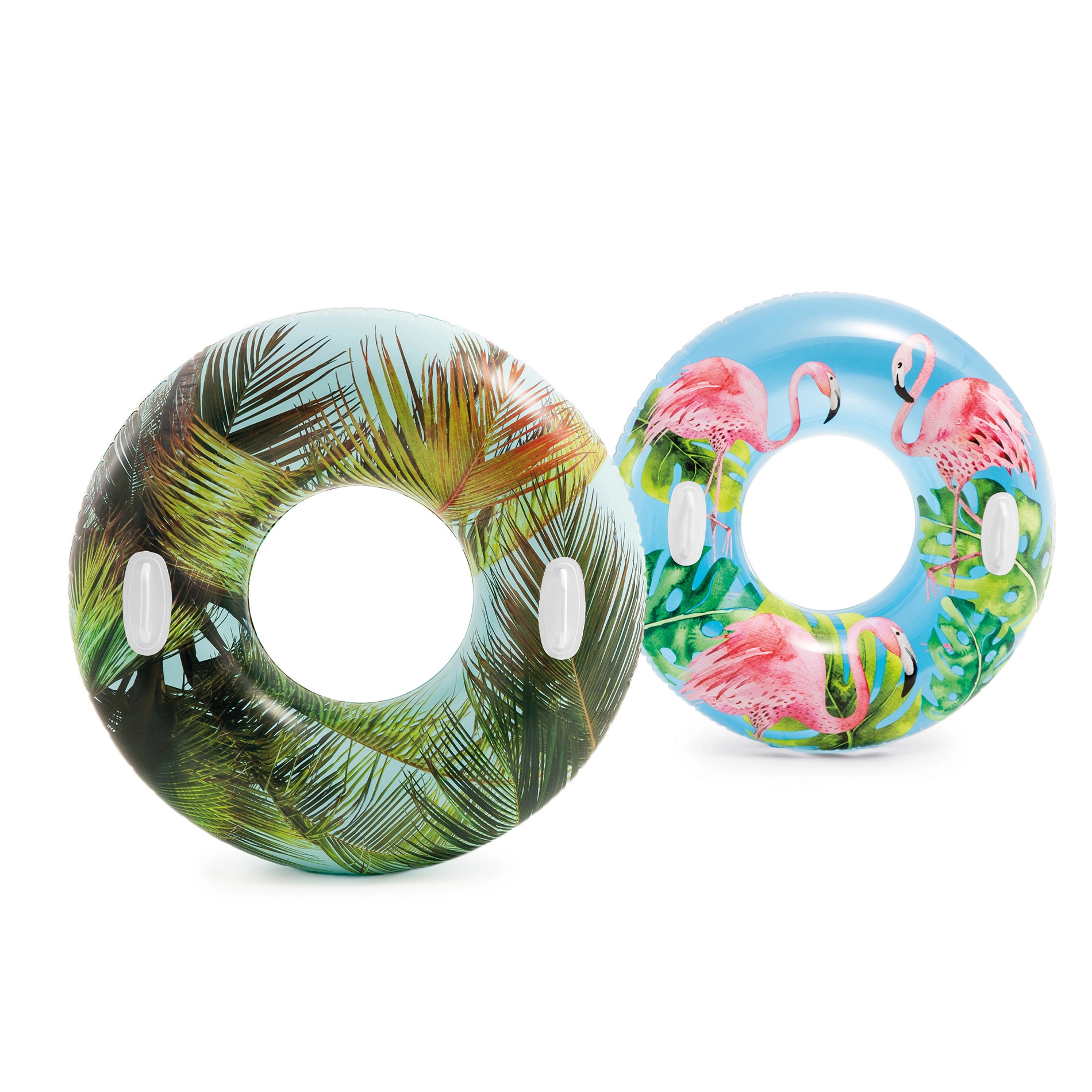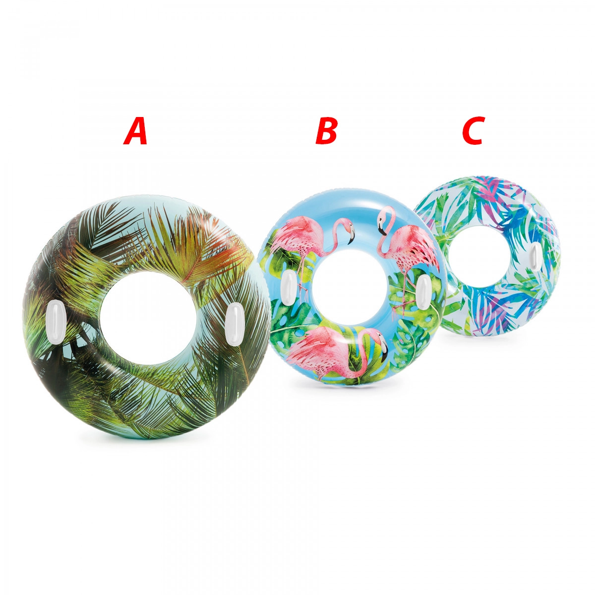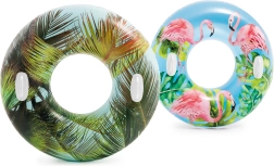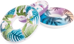 Izturīgais 0,25 mm biezais materiāls labi kalpo gan pie baseina, gan jūrā. Pateicoties tropiskajiem motīviem ar palmām vai flamingiem, riņķis piesaista uzmanību un jūsu vasaras ekipējumam piešķir svaigu stilu.