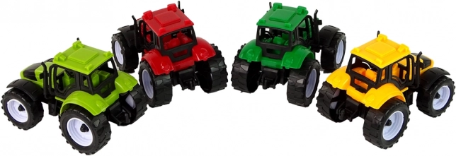Komplektā ir traktori četrās krāsās: tumši zaļa, gaiši zaļa, oranža un sarkana.