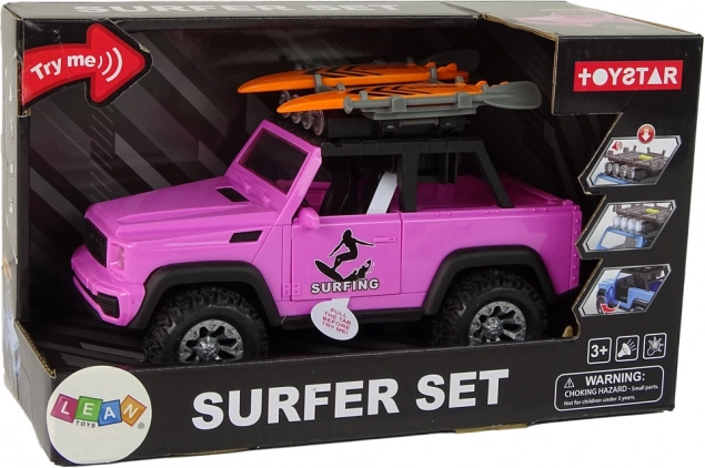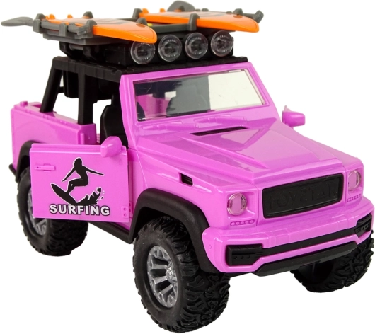 Stilīgs rozā apvidus auto mērogā 1:14 iepriecinās mazos piedzīvojumu meklētājus ar sērfinga tematiku. Tas piedāvā inerces piedziņu, gaismas un skaņas efektus, atveramas durvis un uz jumta turētājus sērfo dēļiem ar airiem. Izturīgā konstrukcija ar lieliem riteņiem ir ideāla radošai spēlei gan mājās, gan ārā.