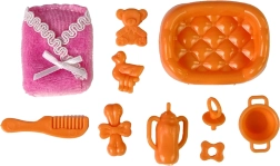 Komplektā ir daudz aksesuāru, tostarp birste, knupītis, pudelīte un citi, kas bērniem ļauj rotaļīgi rūpēties par lellēm.