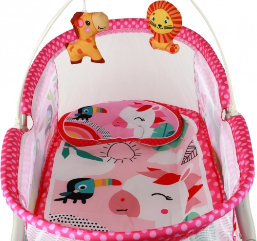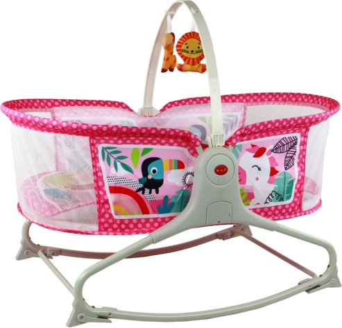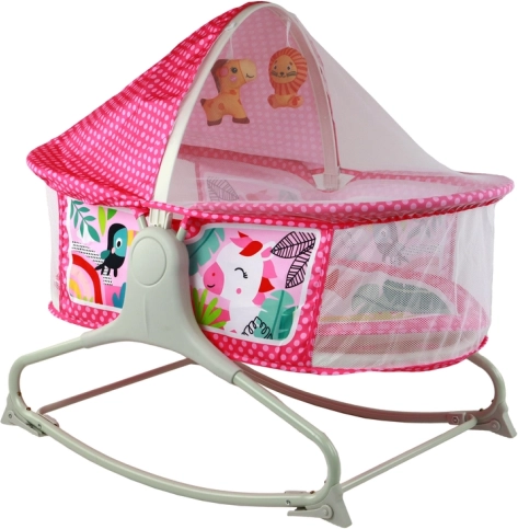 Multifunkcionālā bērnu gultiņa ar šūpuli 2-in-1 piedāvā ne tikai ērtu vietu miegam, bet arī paklājiņu un šūpuli vienā. Rozā krāsa rada draudzīgu vidi bērniem, un tīkliņš un jumtiņš pasargā bērnu no kukaiņiem un saules, kas ļauj mierīgi gulēt svaigā gaisā. Iespēja pārvērst šūpuli par stabilu gultiņu, izklājot kājiņas, nodrošina papildu daudzveidību.
