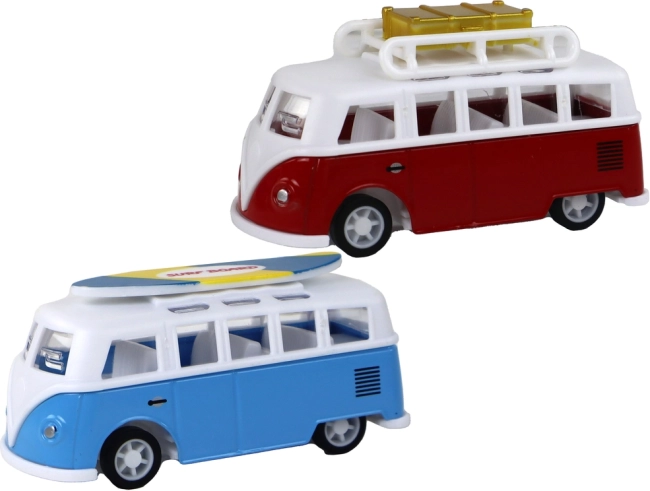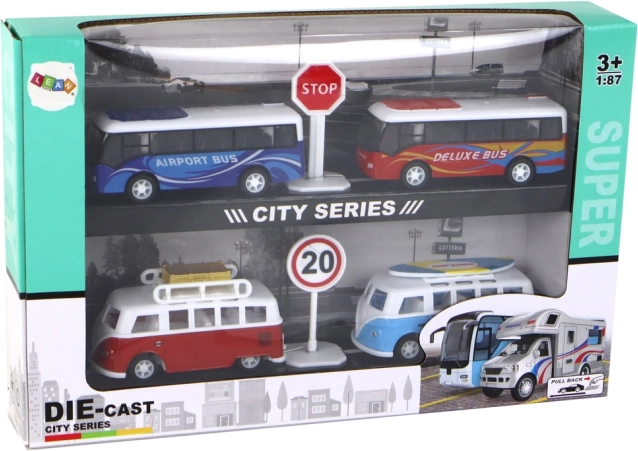 Iepakojumā atradīsiet 2 kemperus (sarkanu un zilu) un 2 autobusos (zilo “Airport Bus” un sarkano “Deluxe Bus”), kā arī ceļa zīmes. Izturīgs izpildījums un reālistiskas detaļas (logi, sēdekļi, jumta bagāžnīca vai sērfa dēlis) padara šo komplektu par lielisku dāvanu mazajiem transportlīdzekļu cienītājiem.