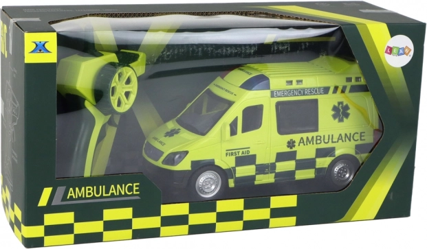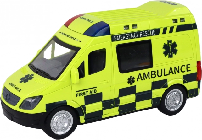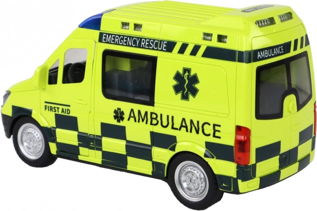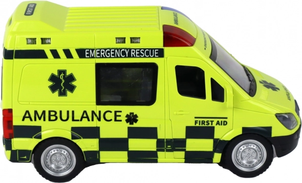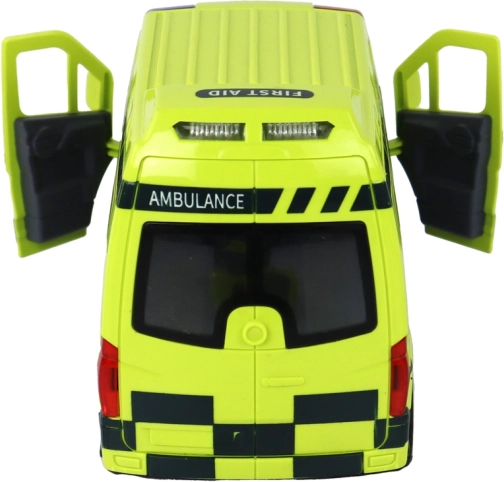 Ātrās palīdzības mašīna ir veidota tā, lai uzticami atdarinātu īstus glābšanas transportlīdzekļus, tostarp detalizētus riteņus, logus un uzrakstus.